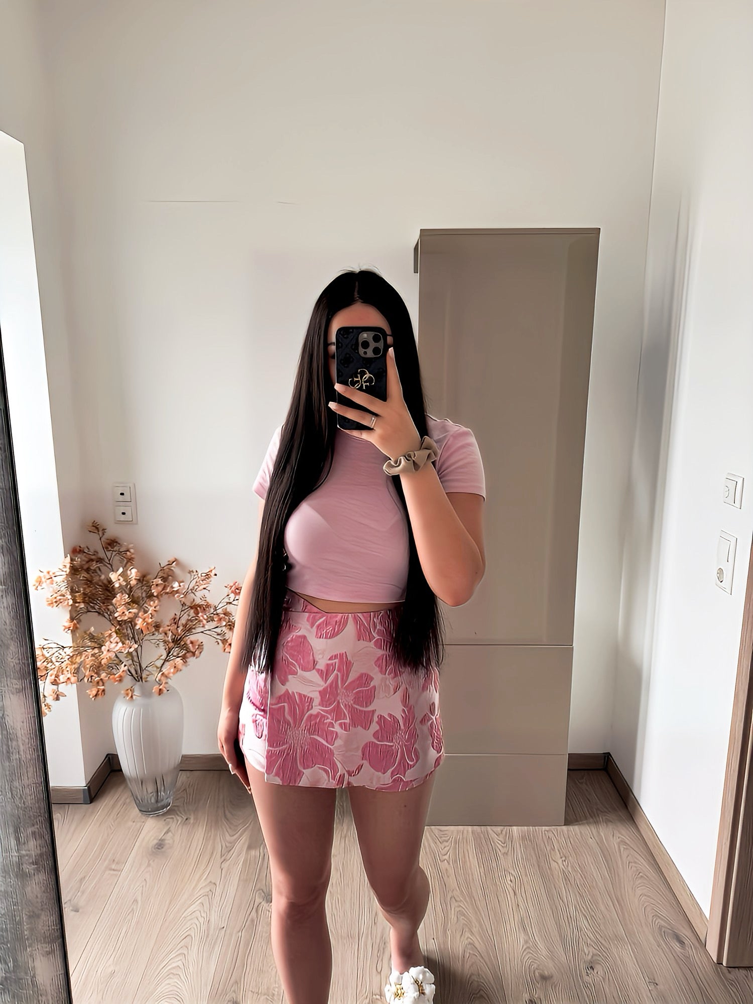 Dieser Hosenrock ist mehr als nur ein Fashion-Piece – er ist ein echter Hingucker! In zartem Rosa und mit edlen, glänzenden floralen Details verziert, bringt er Eleganz und Stil auf den Punkt.