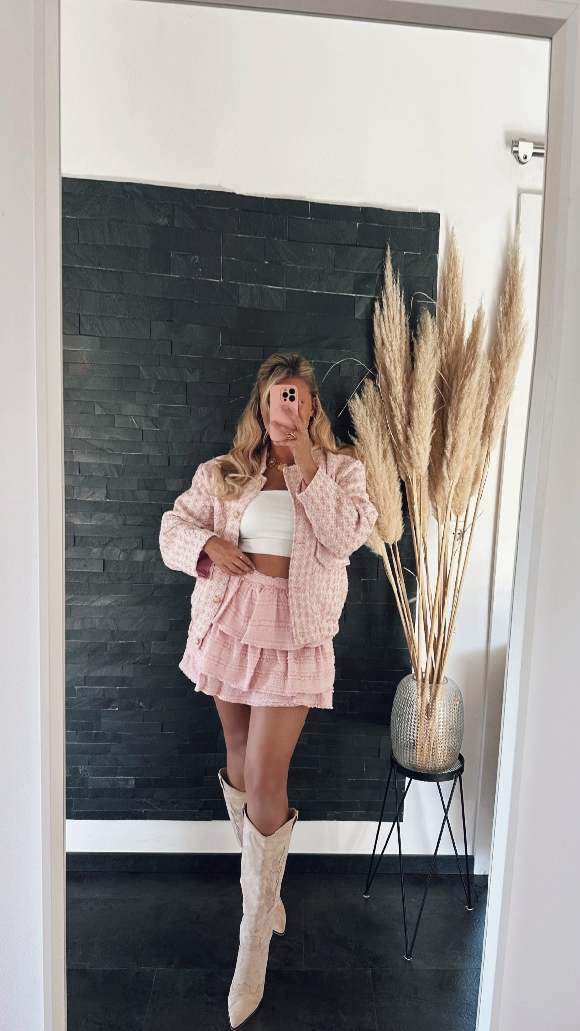 Entdecke den zauberhaften Rock mit Volant in einem zarten Rosa – ein süßes und elegantes Statement-Piece für deine Garderobe! Der fließende Stoff und die verspielten Volants sorgen für einen romantischen Look, der gleichzeitig feminin und modisch ist. Egal, ob du ihn mit einem schlichten Top oder einem schicken Blusenstyle kombinierst, dieser Rock trifft genau den richtigen Ton für zahlreiche Anlässe. Lass dich von seinem Charme verzaubern und bringe frischen Wind in deinen Kleiderschrank!