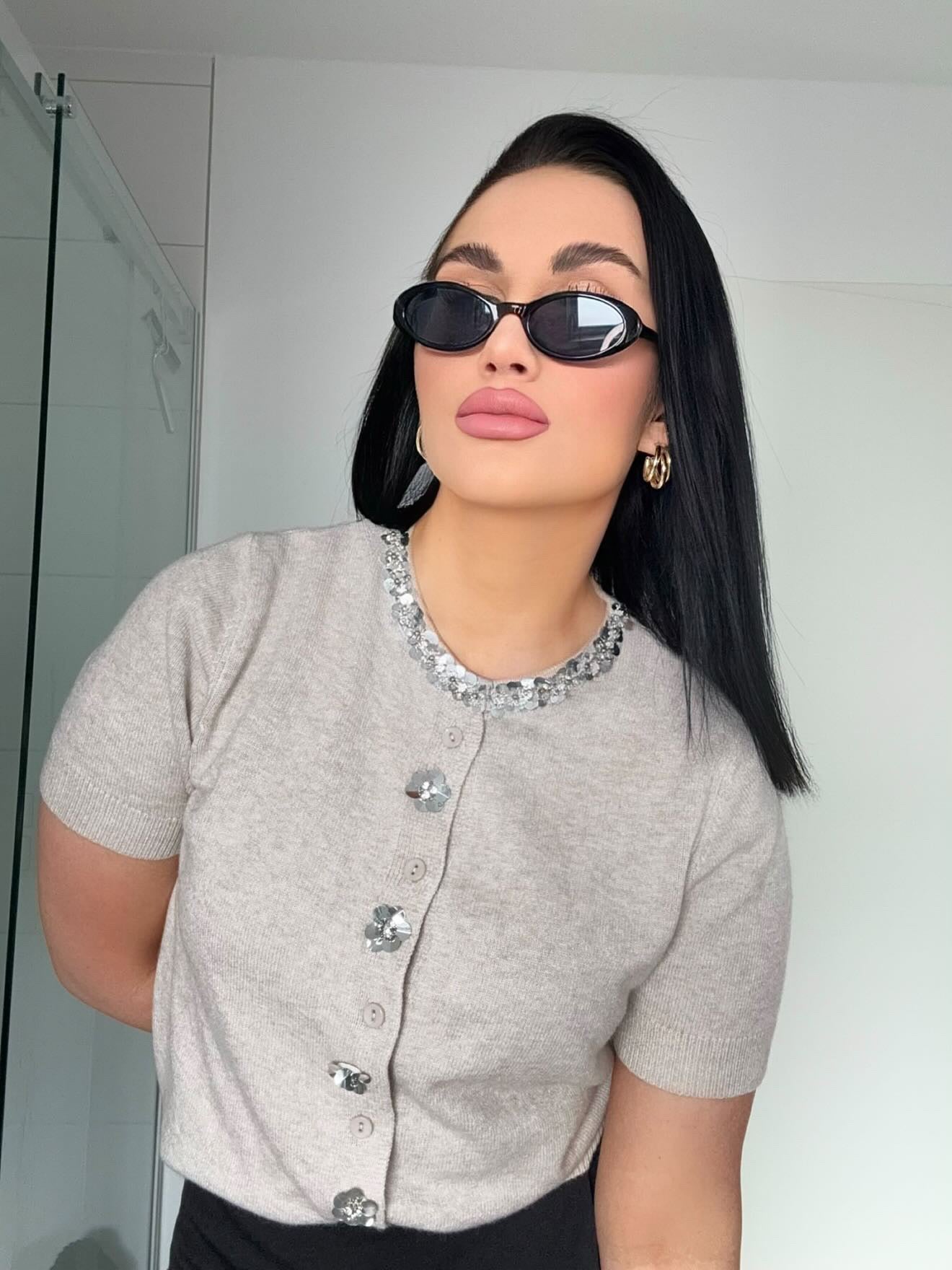 Zarte Eleganz trifft auf funkelnde Details: Der Pearl Beige Cardigan begeistert mit feinem Strick, glänzenden Knöpfen und glitzerndem Kragenbesatz.