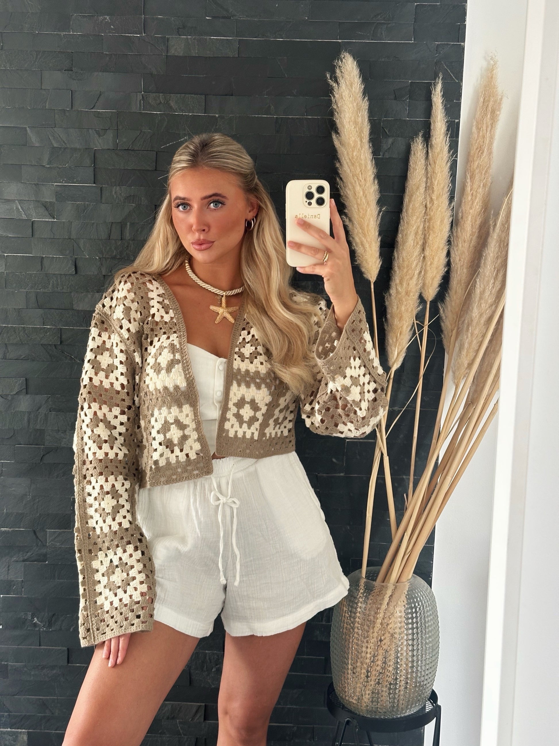 Entdecke deinen Boho-Liebling: Diese gehäkelte Strickjacke im Patchwork-Design ist ein echtes Trendteil. In natürlichen Farben gehalten, lässt sie sich wunderbar mit Jeans, Kleidern oder Röcken kombinieren – ein Must-Have für kreative Fashionistas!