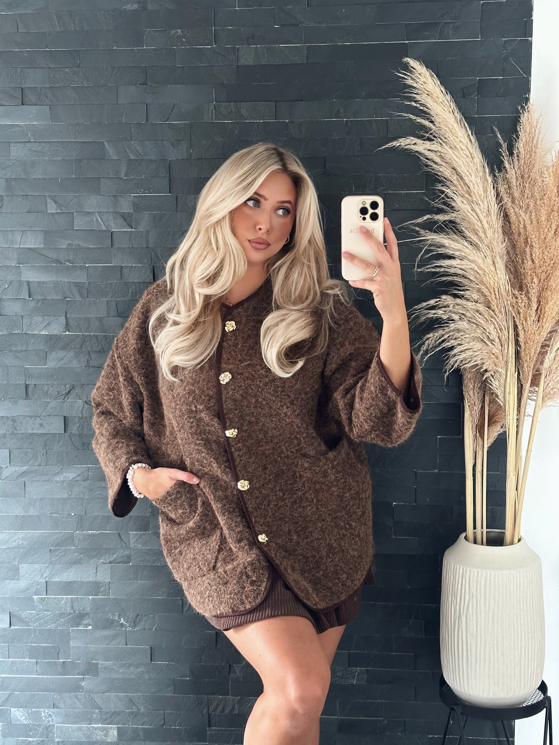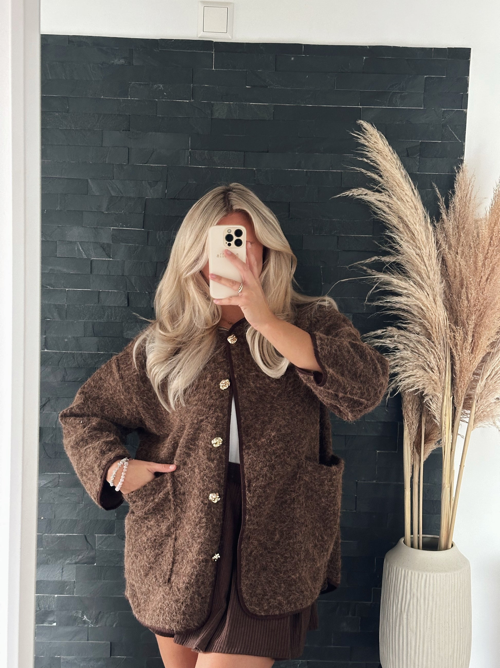 Entdecke die Classy Jacke in Braun – eine elegante Jacke mit goldfarbenen Knöpfen, geradem Schnitt und weichem Stoff. Ein perfektes Piece für feminine Everyday-Looks, das sich vielseitig kombinieren lässt.
