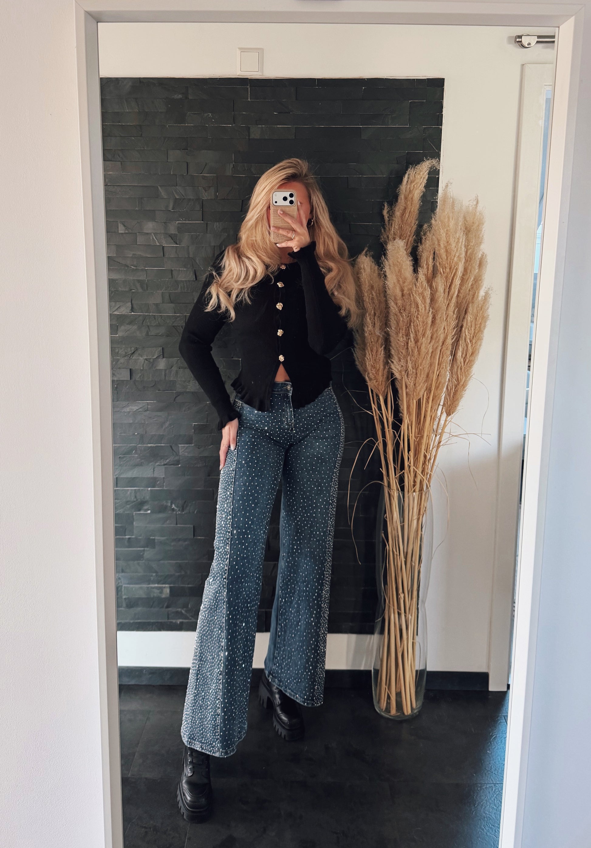 Glamour trifft Denim. Diese High-Waist-Jeans ist mit funkelnden Strassdetails veredelt und bringt sofort Party-Vibes in jeden Look. Perfekt für stylische Winterabende oder besondere Anlässe.