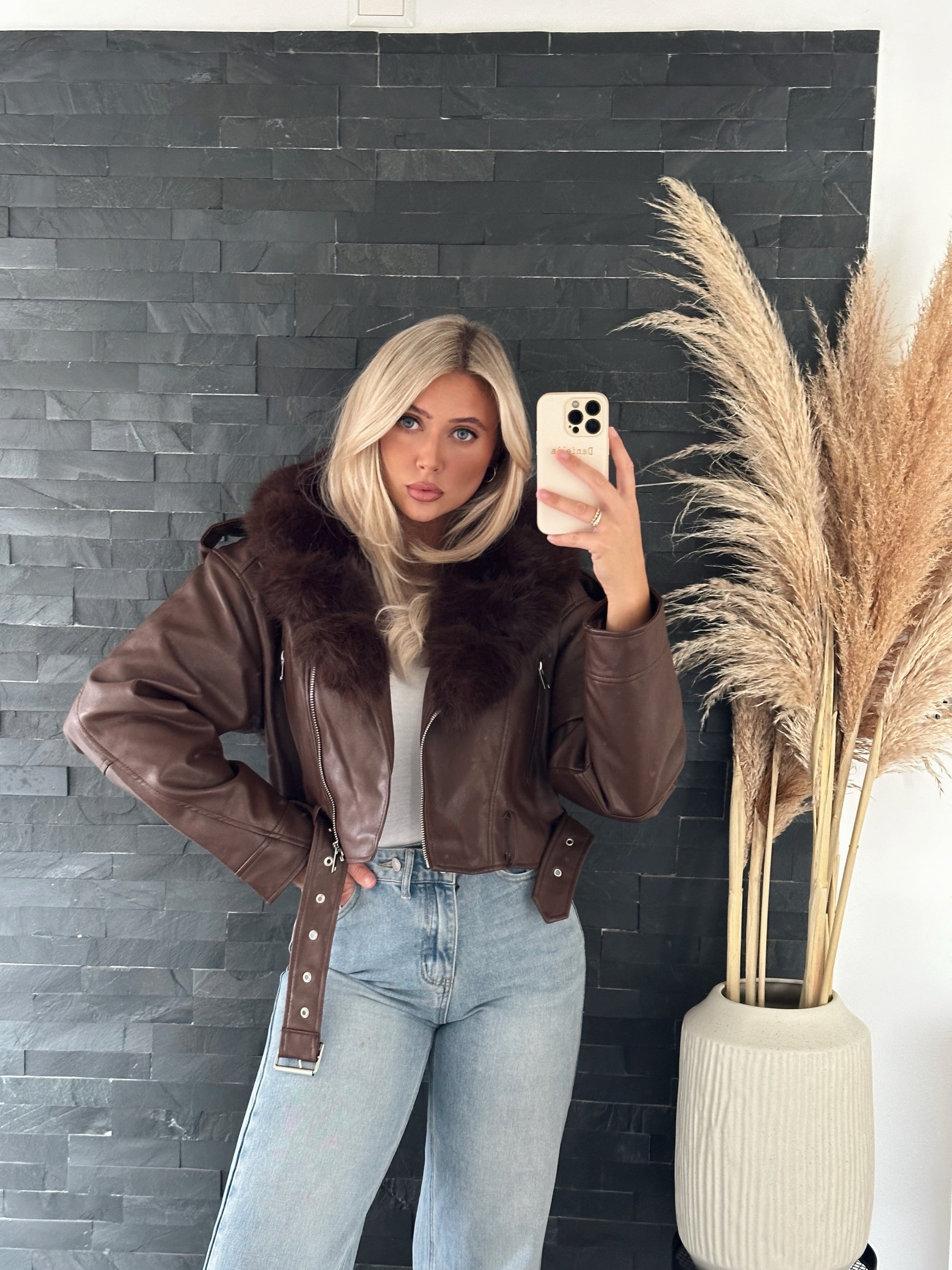 Entdecke die cropped Bikerjacke in Braun mit Fellkragen – edgy, kuschelig und absolut im Trend.