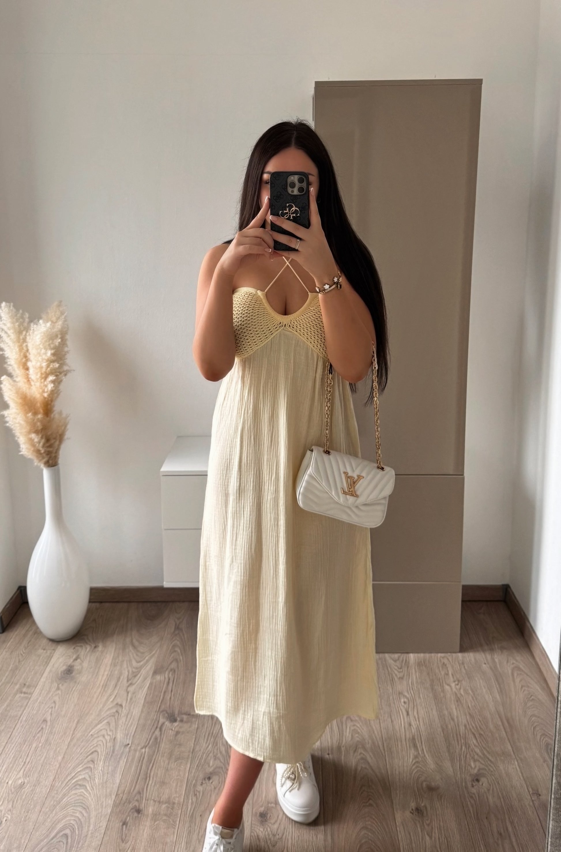 Entdecke unser luftiges Musselin Kleid Lina – dein neuer Sommerfavorit! Der zarte Gelbton, das gehäkelte Bustier und der fließende Schnitt machen dieses Kleid zum perfekten Begleiter für warme Tage.