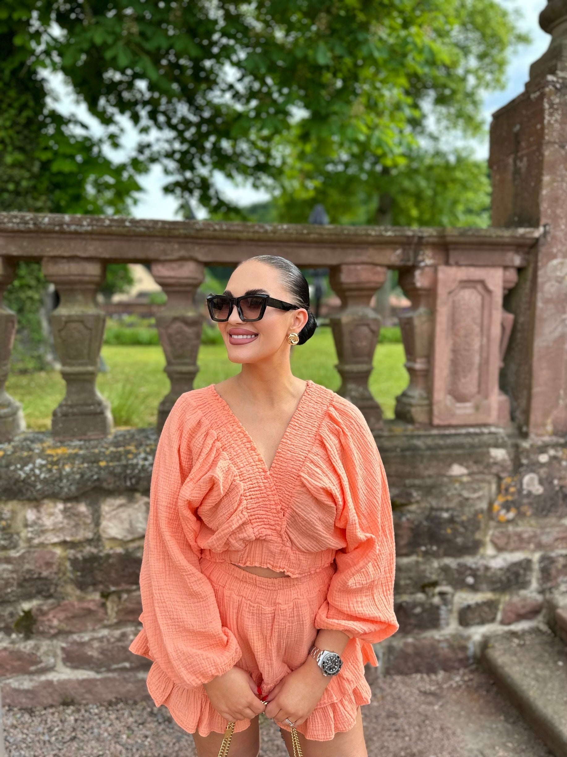 Luftig, stylisch und super bequem – unser Musselin Set in der Trendfarbe Orange ist dein perfekter Begleiter für warme Tage. Ob für den Strand, die City oder gemütliche Stunden zu Hause: Dieses Set aus Shorts und passendem Oberteil bringt Leichtigkeit in deinen Look. Gönn dir dieses bezaubernde Musselin-Set und genieße den Sommer in vollen Zügen – stilvoll, bequem und natürlich!
