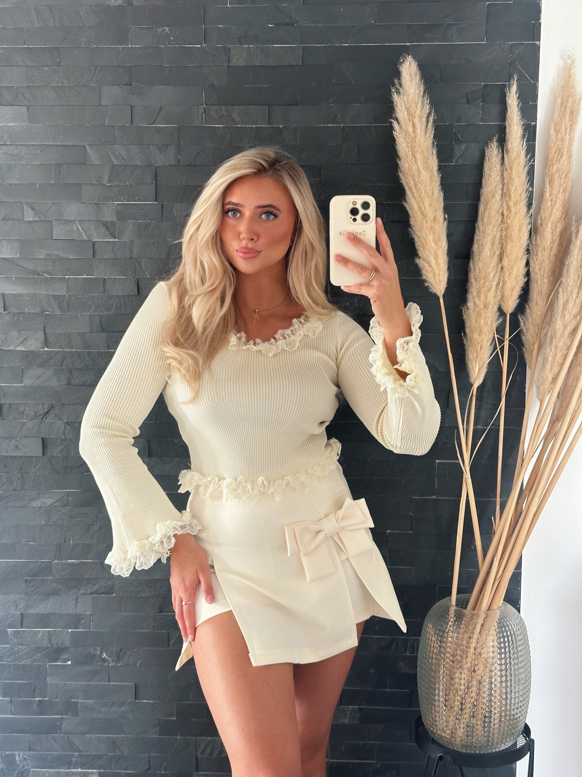 Entdecke das perfekte Oberteil für romantische Outfits: „Bellezza“ verzaubert mit weichem Rippstrick und zarten Spitzendetails an Ausschnitt, Taille und Ärmeln. Feminin, elegant und super angenehm zu tragen.