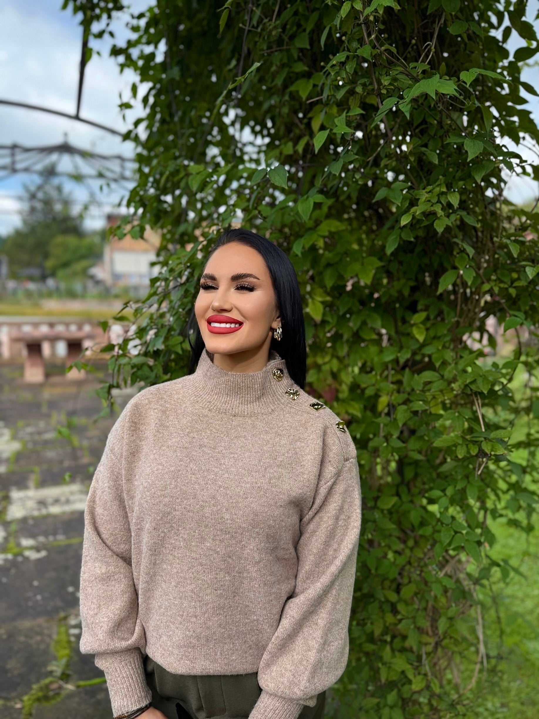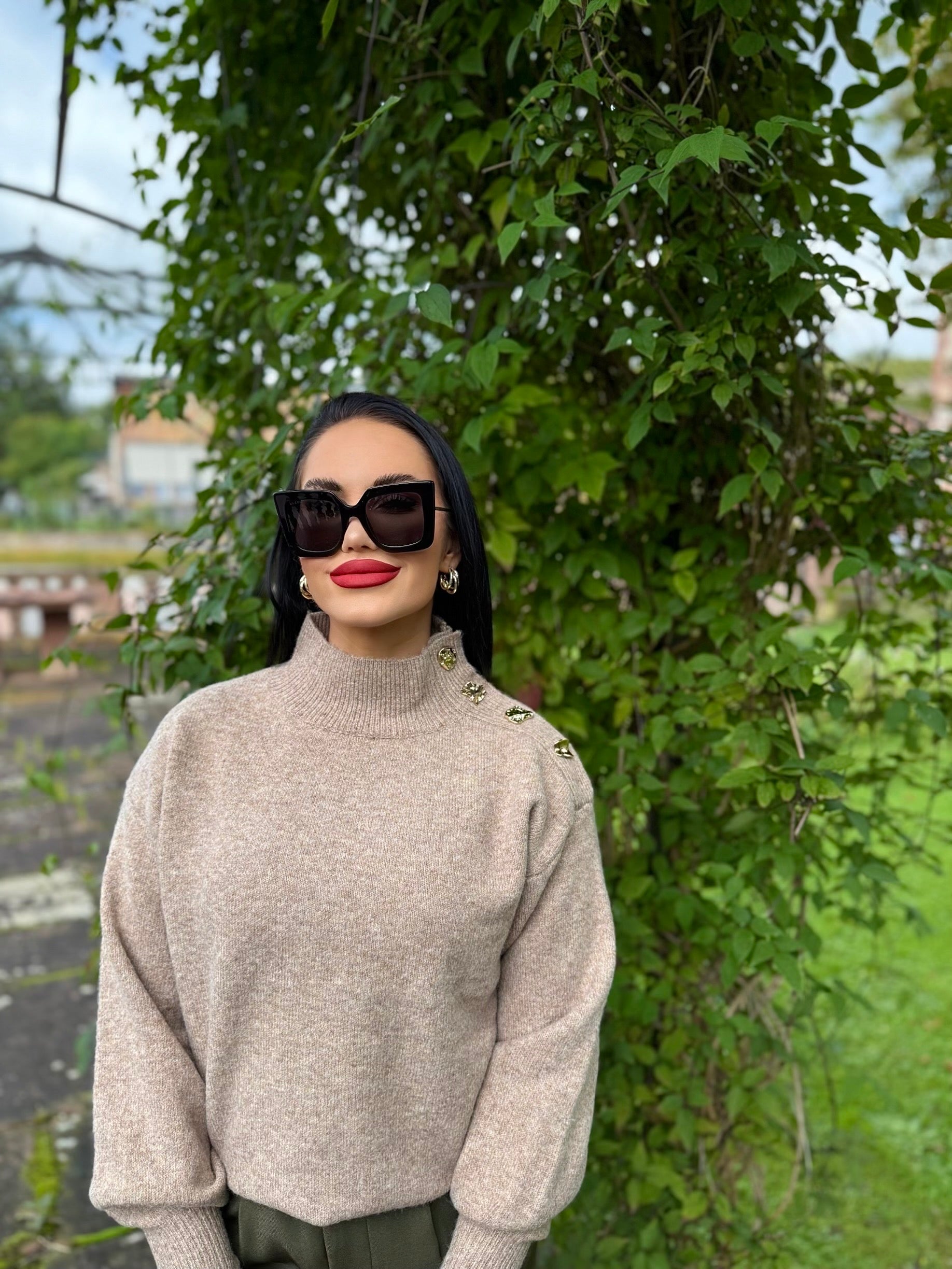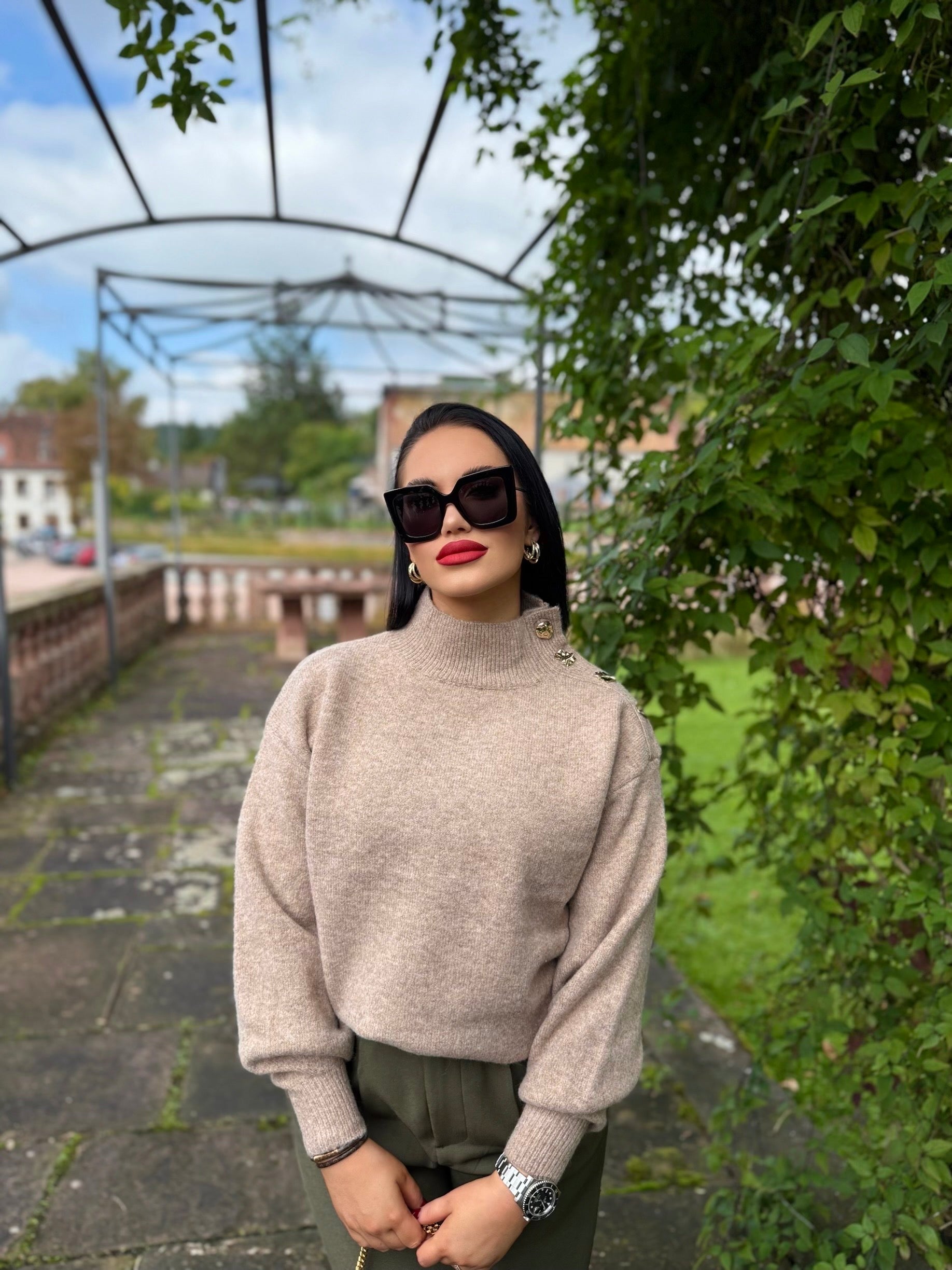 Entdecke den Strickpullover in Camel mit Knopfdetails an der Schulter – schlicht und dennoch besonders.
